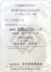 SPECIFIC GRAVITY(比重):Sinks in コロンビア産Guatéque鉱山ユークレース 1.015ct heavy liquid S.G.3.05 and floats on S.G.3.32